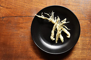 3.揚げ油を180°に加熱し、2にわさびの根に衣をつけ揚げ油に落とす。
